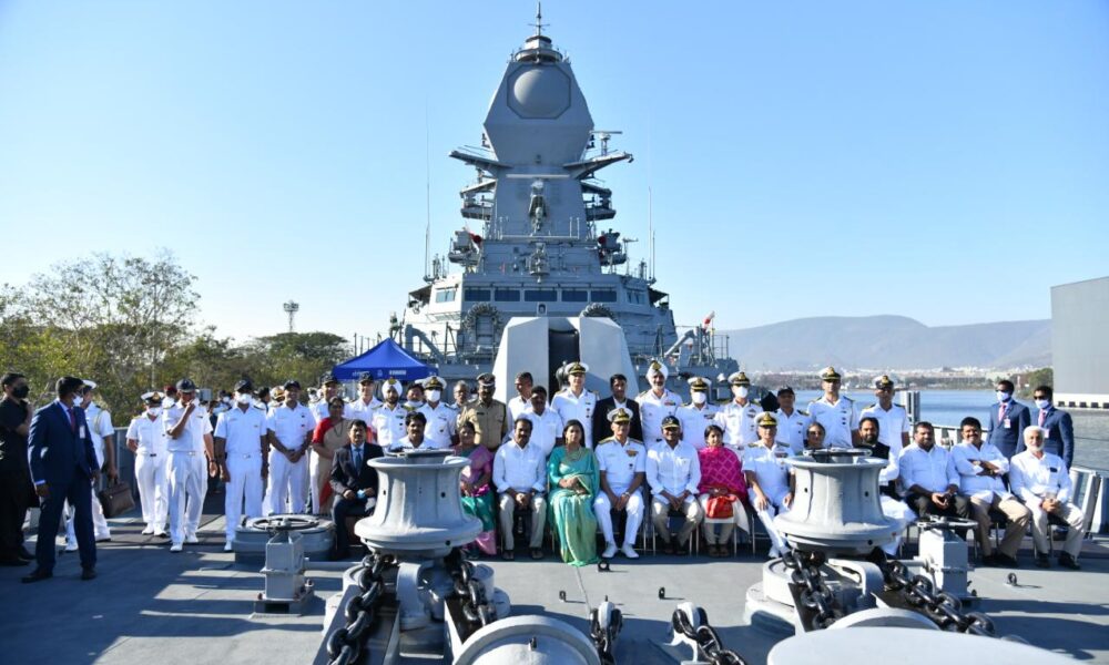 Shri Jagan Mohan Reddy Hon’ble CM of Andhra Pradesh dedicated INS Visakhapatnam, the indigenously designed and constructed guided-missile stealth destroyer named after the City of Destiny – Visakhapatnam, in a formal ceremony held at Naval Dockyard on 27 Feb 22. The ship is on her maiden visit to the port for participating in the PFR and MILAN 2022.