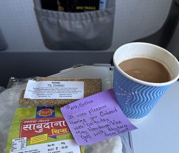 The Indigo crew member provided Bothra with sabudana chips, sesame seed chikki and tea, along with a note which read: “Mr Bothra, it was a pleasure having you onboard with us today. May Ma Durga bless you with abundance.”