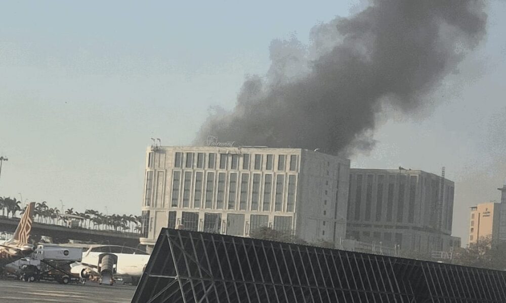 A massive blaze engulfed the rooftop Fairmount restaurant near Terminal 2 of the Chhatrapati Shivaji Maharaj International Airport in Mumbai on Saturday.the fire erupted at the Fairmount Hotel.