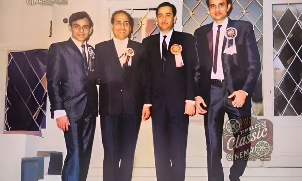 A cherished moment from Bollywood’s golden era, featuring three legends—music maestros Kalyanji-Anandji, the legendary voice of Mohammed Rafi, and the evergreen showman Raj Kapoor.