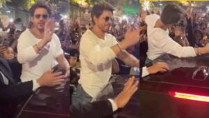 In a video shared by a fan account, Shah Rukh, dressed in a white full sleeve T-shirt and denims, stood on the edge of his car. A sea of his fans stood around the vehicle, chanting his name and waving.
