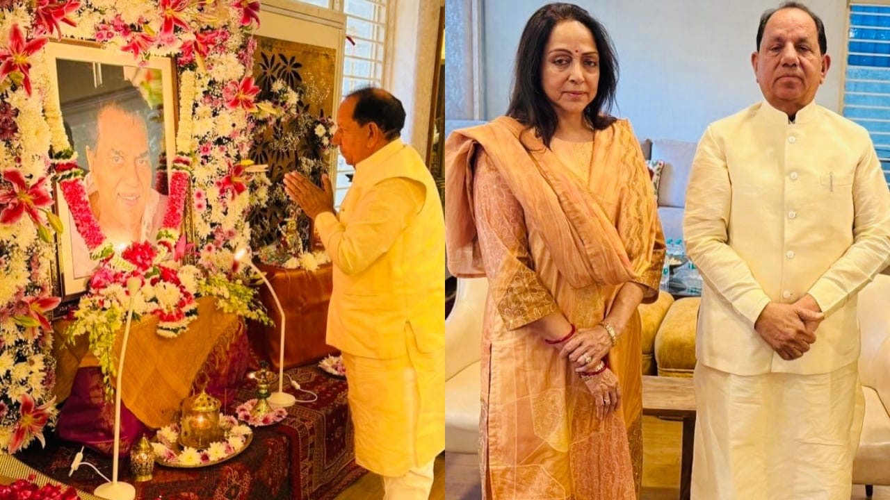 One of the images from the visit shows Maharia placing flowers before Dharmendra’s decorated portrait, surrounded by a traditional floral arrangement and offerings. Another photograph captures him sitting beside Hema Malini, who appeared visibly emotional as she continues to navigate the days following her husband’s death. The quiet meeting underlined the deep respect Dharmendra commanded across political and cultural spheres.